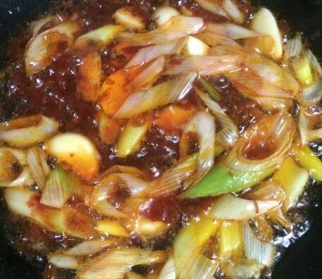 锅放多点油,下花椒、葱蒜、豆瓣酱炒香。