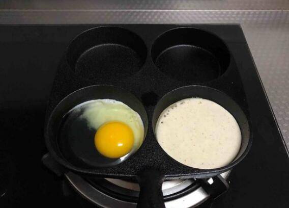 当面糊凝固时将煎熟的鸡蛋倒扣在面糊上,另一锅眼倒入面糊