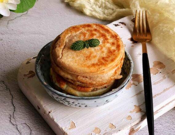 面糊凝固将有鸡蛋的面饼连同鸡蛋一起倒扣在面糊上,反复翻面直至煎熟即可