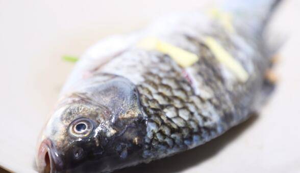 1、准备食材,将鱼清理干净划三刀,葱切段,留一根葱绿切末,姜切片,蒜切末。