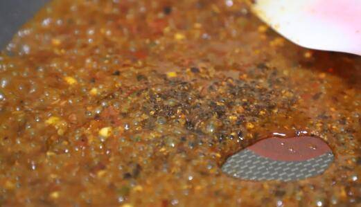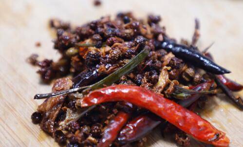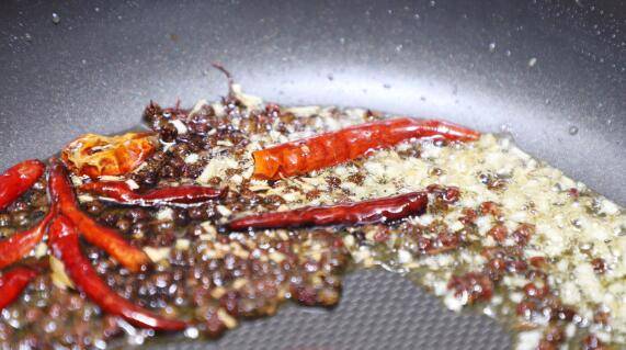 5、煎鱼剩下的油,烧热后倒入辣椒花椒炒香炸脆。