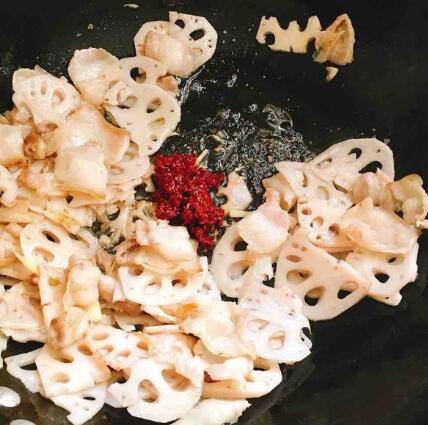 肉片变色后放入藕片翻炒。