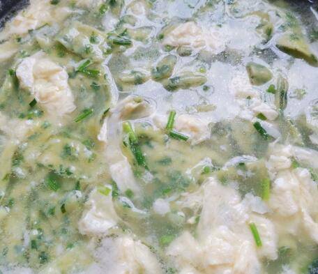 水开后加入调味好的韭菜段,煮两分钟左右,鸡蛋打散,倒入鸡蛋液,关火,出锅。