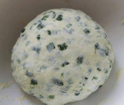 切碎的韭菜叶放入面粉中,加入适量盐,搅拌均匀后加水,边加边搅拌至没有干面粉,和成一个偏软的面团。