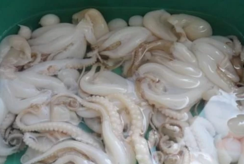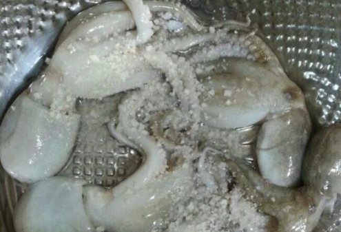 2、冲洗后,放到大盆里,加入适量的水、盐和醋,不断的搓洗,把八爪鱼的粘液清洗干净为止。