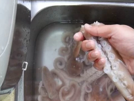 3、清洗八爪鱼。把八爪鱼的眼睛、牙齿、内脏等全部抠掉,清洗干净八爪鱼的墨汁。这个清洗过程相对久一些。