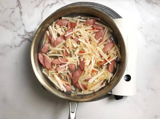 5、翻炒至白萝卜丝透明且发软后加入盐调味。