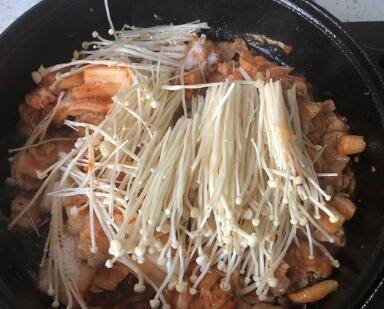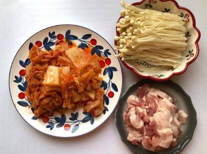 准备食材:泡菜300克、五花肉200克、金针菇150克。辅料:白糖15克、食盐4克。