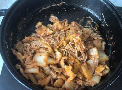 泡菜炒均匀后放入金针菇,白糖,食盐快速翻炒。如果觉得泡菜够咸了,就不用再另外放盐了。