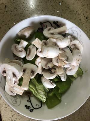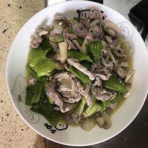 用料:青椒2个、肉丝200克、姜2片、盐适量、蘑菇5-6个。