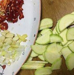 用料:青椒、花生油、盐、鸡粉、茭瓜2~3根、蚝油、花椒、葱姜蒜、干辣椒、料酒、醋。