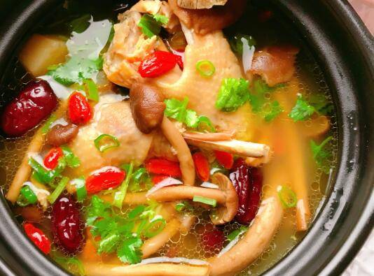 最佳答案老母鸡500g、枸杞20g、红枣20克、茶树菇200g、姜5片、盐一小勺、料酒一小勺、山药半根、小葱4颗。老母鸡一只净膛洗好,煮一遍掉水洗干净。把配料洗干净,切好备用。锅里放老母鸡和所有的食材,加入满锅的水,大火烧开,小火慢炖2个小时以上。出锅的时候放盐即可。
