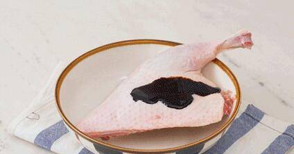 3、洗好的鸭腿涂抹上少许老抽,煎鸭前抹上老抽,可以使表皮上色,卤完后也能维持红亮的颜色。