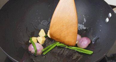 6、另起锅,加少许油加热,下入姜块、红葱头、蒜粒、葱段小火煸香,下入调好的酱汁,加入500ml-700ml清水,大火煮至沸腾。