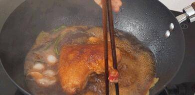 7、锅中加入1个八角、2片香叶、30g红片糖,煮至片糖融化,下入鸭腿,盖上锅盖,小火煮10分钟。