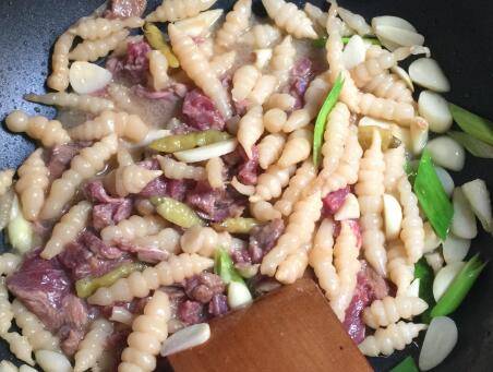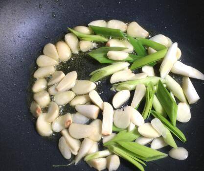 放油热锅,把蒜仁大蒜炒香,再放牛肉。