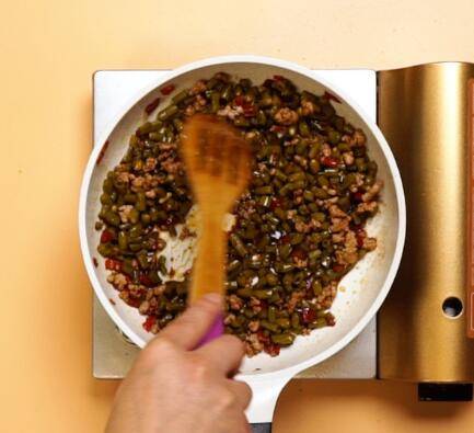 倒入猪肉末,翻炒均匀,倒入料酒,煸炒至肉末变色。