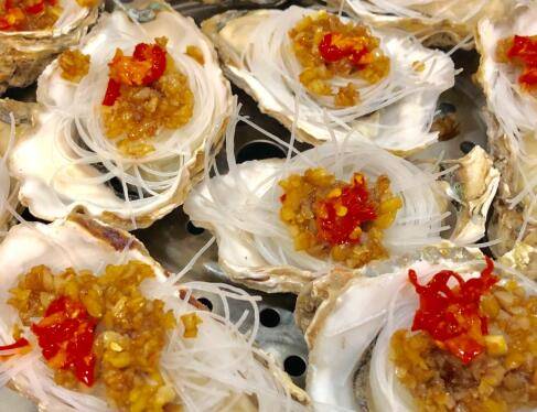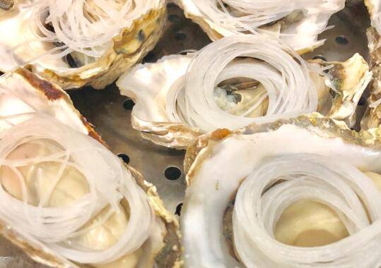 将洗干净的生蚝放入蒸锅,此时可以开火,边烧水边在生蚝上加食材。放入泡好的粉丝,粉丝不要加太多。