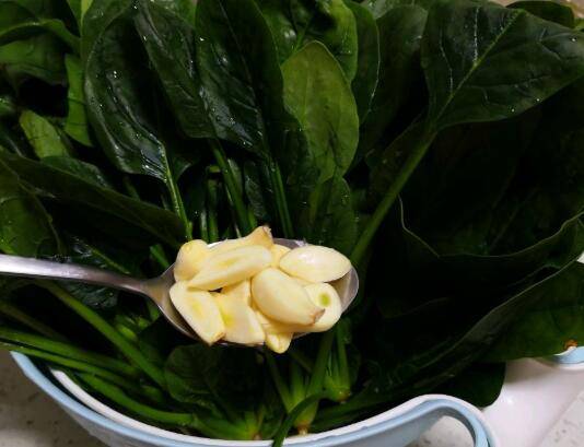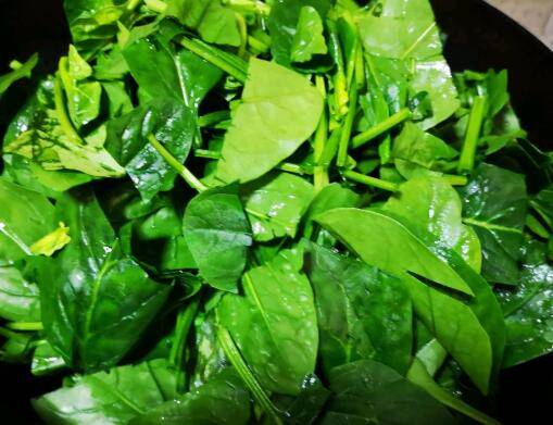 3、加入菠菜翻炒,加入少许的盐,翻炒时从底下往上面翻。