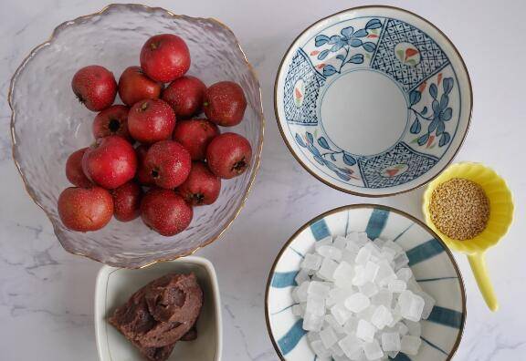 用料:冰糖150克、水150克、山楂、竹签、红豆沙、熟白芝麻。