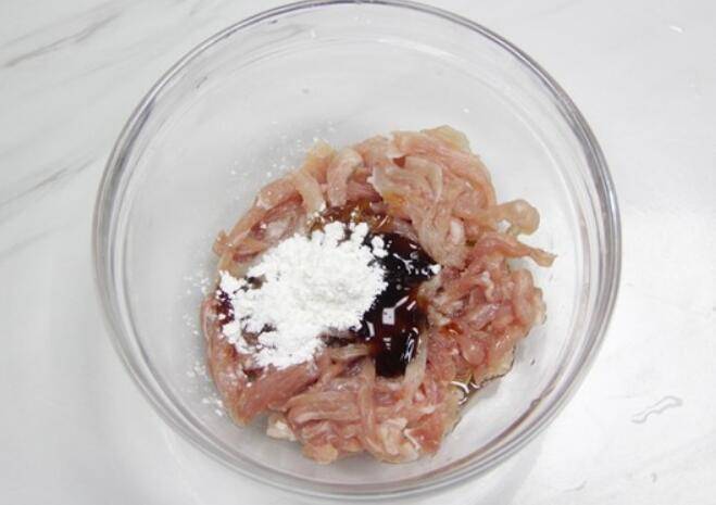 9.锅里放入适量的花生油,把前面腌制好的瘦肉丝倒入锅中,翻炒。