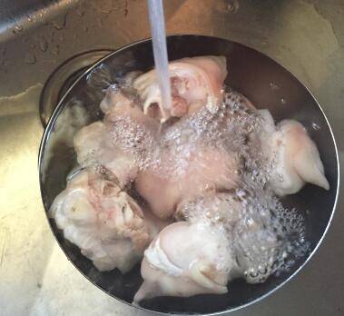 2、冷水下锅,水开出锅,目的是要把猪蹄里面的脏东西煮出来。