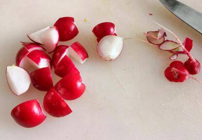 1、樱桃萝卜去掉两头,切成小块,洋葱切丝。