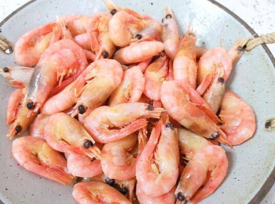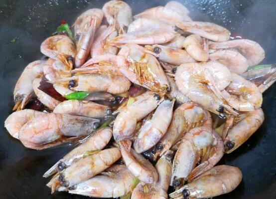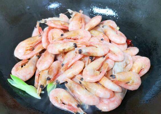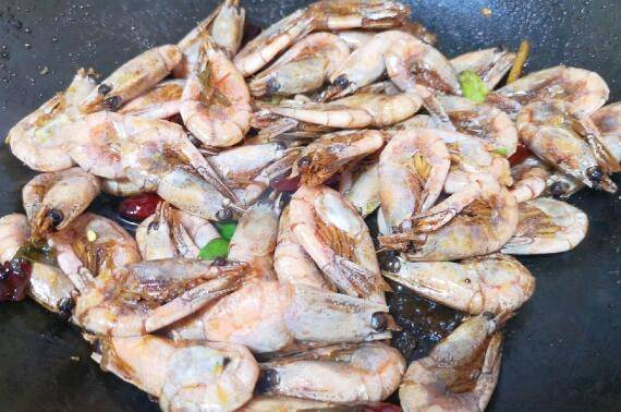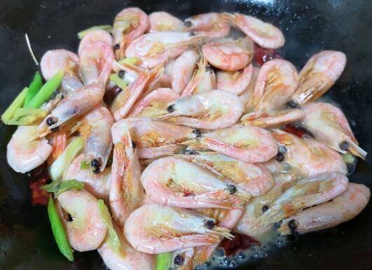 用料:北极甜虾400g、蒜苗1棵、生姜3片、干红辣椒5个、红烧酱油1勺、料酒1勺、盐适量、糖适量、醋少许、调和油适量。