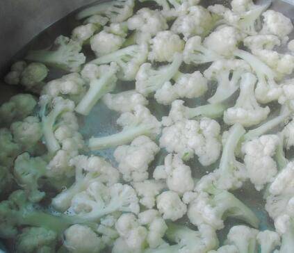 4、锅中烧开水,放入菜花稍焯烫捞出沥水。