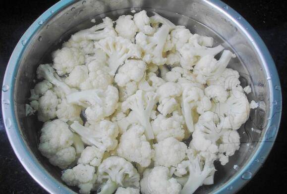1、菜花切成小朵放淡盐水中浸泡10分后洗干净。