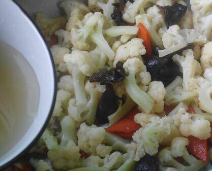 用料:花菜1棵、胡萝卜50克、黑木耳5克、青蒜2棵、蒜2瓣、鸡汤少量、酱油1汤匙、水淀粉少量、盐适量、花生油适量。