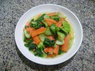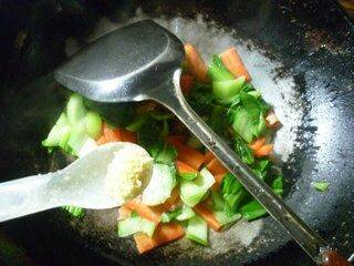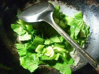 4、烧锅倒油烧热,下入切好的青菜翻炒一下。