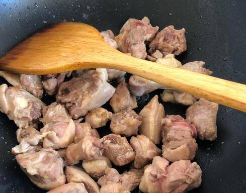 先把鸭肉油脂煸炒出来,加白糖炒出糖色。