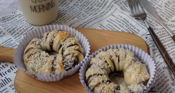 13、盖上保鲜膜,放烤盘中第二次发酵发至两倍大,表面刷鸡蛋液,撒上白芝麻和椰蓉。