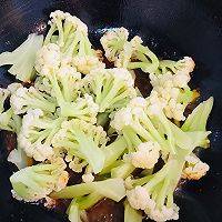 4、放入花菜翻炒,盖上盖子焖两分钟。