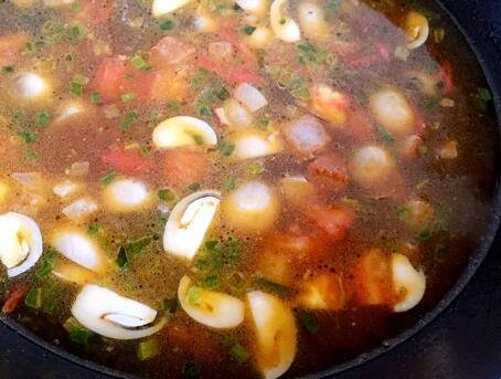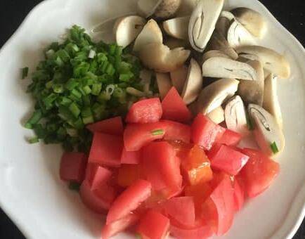 小葱切碎,草菇一个切四瓣,西红柿切粒。