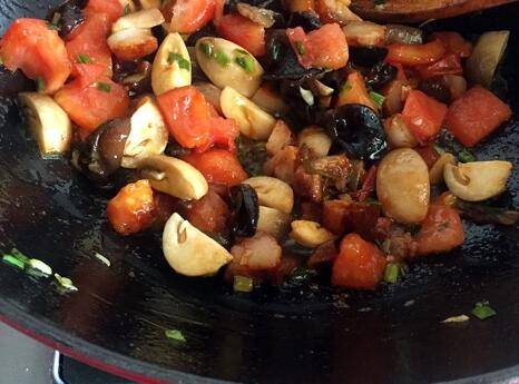 加入草菇,红烧肉粒,黑木耳!因为我是熟的肉所以就不提前煸炒肉片了,如果是用的生肉片要在放西红柿之前煸炒一下哦。