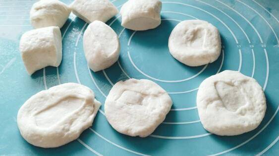 7、取一个剂子按扁,中间放馅,包成包子样。