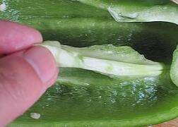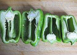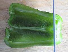 1、青椒洗净去根,刀背向下将青椒横刀切成两瓣。