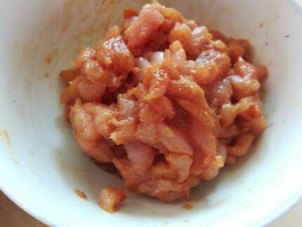 3.瘦肉切丁,用适量盐、生抽、老抽、腌制一会儿。