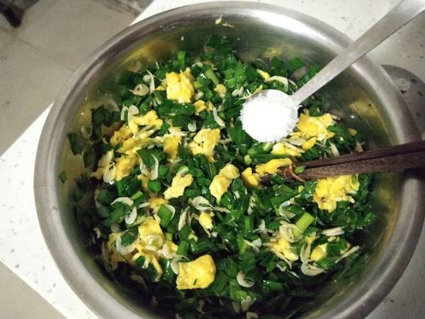 10、待鸡蛋碎自然凉后,倒入拌好的韭菜中,再次拌匀。