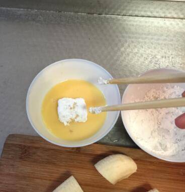 香蕉切段,去掉坏掉的部分,香蕉段在蛋清里多滚几次。