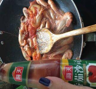 再把大虾倒入锅中和番茄一起翻炒。