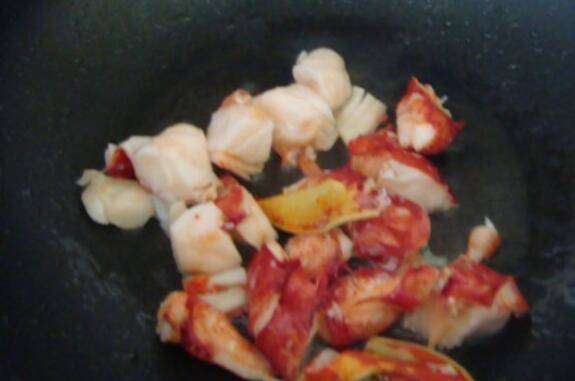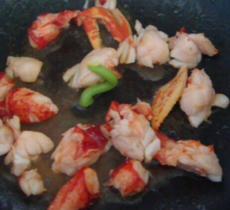 将芥末和生抽放入经过爆香的龙虾肉锅里,快速翻炒均匀。