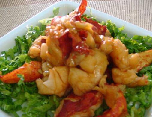 切少许生菜丝铺在盘里,将炒好的芥末龙虾肉放入盘里即可。