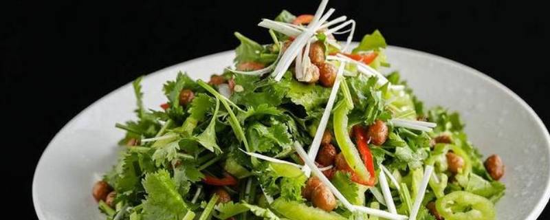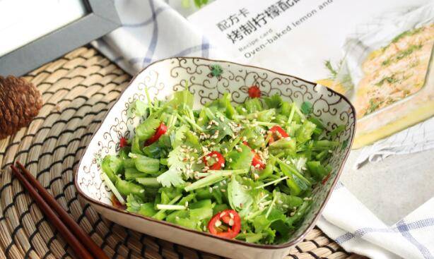 3、少许香油提香,放入香菜、青椒、杭椒拌匀即可。