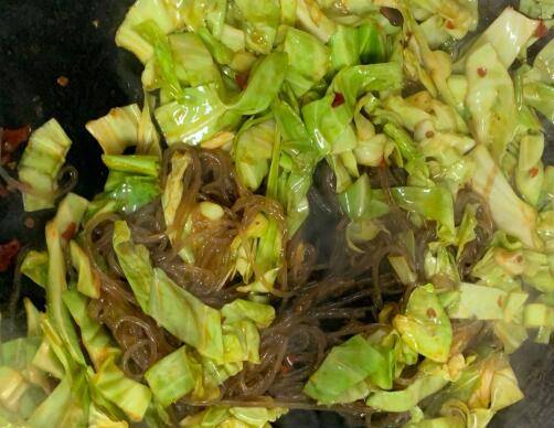 加入粉丝,倒入两勺酱油,两勺鸡精,翻炒均匀后即可出锅。