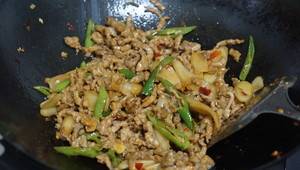 4、不停翻炒肉丝,炒至肉丝全部变色以后,放入嫩姜继续翻炒几下。