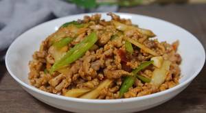 1、猪肉切丝,放入2勺生抽,1小勺盐,半勺郫县豆瓣,1小撮胡椒粉,2小勺淀粉,1勺食用油,抓拌均匀。腌制10分钟。