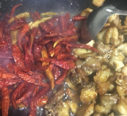准备鸡肉,剁块、一碗干辣椒、花椒粒。